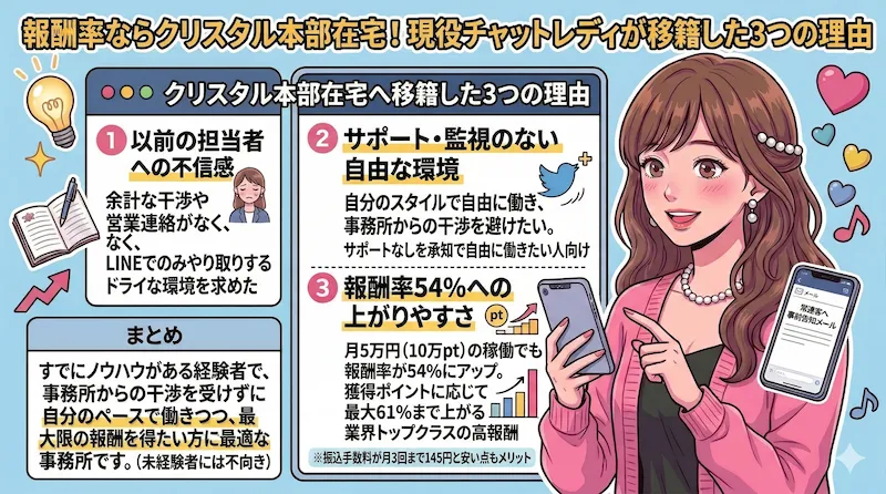今回はクリスタル本部在宅の報酬率や、私がクリスタル在宅本部に移籍した理由などを詳しく解説します。
