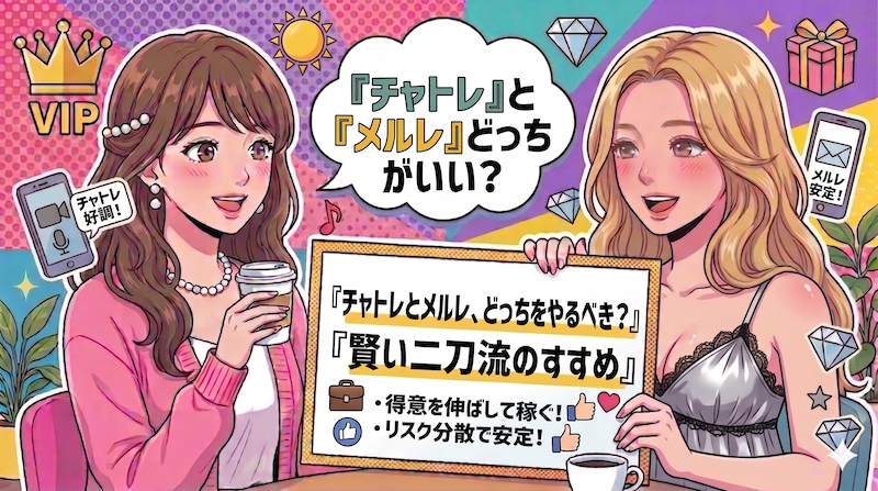 メインでしっかり稼ぐチャトレと、スキマ時間やチャットができない時の補填としてのメルレ。この二刀流が、精神的にもお財布的にも一番安定しそうですね!