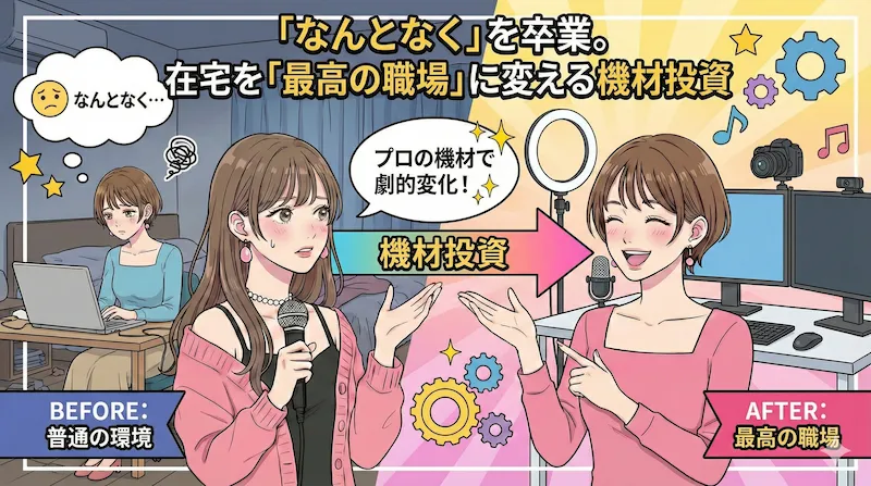 全然違いますね。チャトレ業界の宣伝の通り、スマホひとつでも稼働はできるんですが、リピーターを増やしたり時給をあげられる可能性があるのに、投資しないのは逆にもったいないんです。だから思い切って機材を導入すれば、回収するためにも頑張れるし、配信の利便性やカメラ映えが良くなると、自分とお客様両方の満足度がUPしますよね。もう一つは、機材だけじゃなくて、「画面の中の自分がどう見えているか」を客観的に研究するようになったことです。カメラ越しに男性が釘付けになる角度や、身振り手振り。 「主婦のお小遣い稼ぎ」という甘えを捨てて、画面越しのエンターテイナーとして「自分というコンテンツ」を磨く。その覚悟が時給に跳ね返ってきたんだと思います。