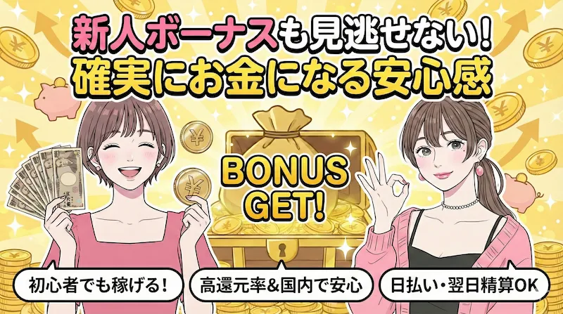 新人ボーナス(最大数万円)や、わかりやすい報酬システム、迅速な精算機能が充実。「今すぐ数万円欲しい」という切実なニーズに、最もリスクなく応えてくれるサイトです。