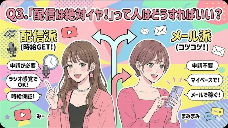そうそう。だから変に気負わなくても、一緒にゲームを楽しむ感覚でいれば大丈夫! 「頑張ってトークしなきゃ!」って思わずに、まずは時給保証もあるし、ラジオ感覚で配信ボタン押してみようよ。