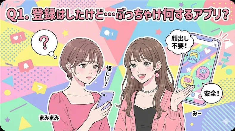あー、通知しつこいよね(笑)。でも大丈夫、顔出しはしなくていいよ! これね、出会い系っていうより「ゲーム」とか「SNS」に近いかな。エッチなのは禁止だし、女性同士で「こんにちは~」って遊びに行ったりもするし。