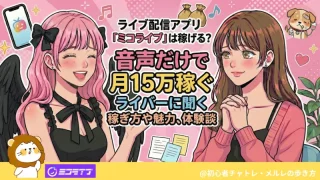 おすすめサービス攻略 ライブ配信アプリ「ミコライブ」は稼げる?音声だけで月15万稼ぐライバーに聞く稼ぎ方や魅力、体験談 「ノンアダルトで安全に稼ぎたいけれど、男性の疑似恋愛の相手をするのにはもう疲れた……」チャットレディやメールレディとして働き、そんな悩みを抱えている女性は少なくありません 。ライブ配信アプリ「ミコライブ」では、顔出し不要のボイス機能があり、... 2026.02.25 おすすめサービス攻略